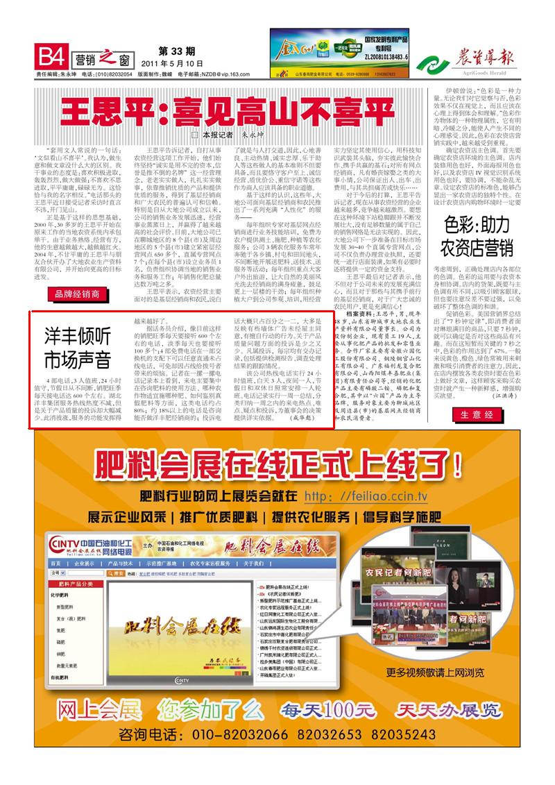 据话务员介绍,像目前这样的销肥旺季每天要接听600个左右的电话,淡季每天也要接听100多个;4 部免费电话在一部交换机的支配下可以任意直通未占线电话,可免却因占线给拨号者带来的烦恼。记者在一摞一摞电话记录本上看到,来电主要集中在咨询肥料的使用方法、哪种农作物适宜施哪种肥、如何鉴别真假肥料等方面,这类电话约占80%;约18%以上的电话是咨询能否做洋丰肥经销商的;投诉电话大概只占百分之一二,大多是反映有些墙体广告未经屋主同意,有擅自行动的行为。关于产品质量问题方面的投诉是少之又少。凡属投诉,每宗均有交办记录,包括提供检测报告、调查处理结果的跟踪情况。