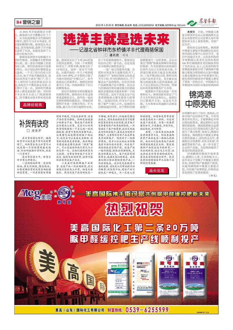 浏览量:8981  2014.11.22  关键词:《农资导报》:选洋丰就是选未来——记湖北省钟祥市东桥镇洋丰代理商骆保国