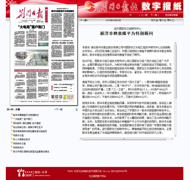 湖北乐鱼体育肥业股份有限公司与国家杂交水稻工程技术研究中心达成战略合作协议,4月2日在海南三亚签约,中国工程院院士袁隆平被聘为乐鱼体育肥业特别顾问,乐鱼体育肥业总经理杨华锋向袁隆平颁发了聘书。